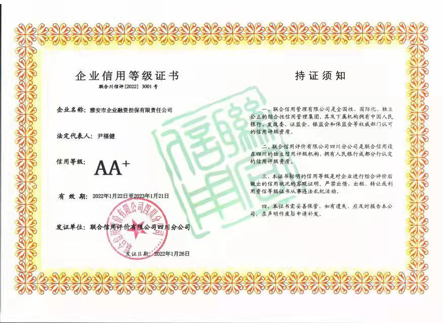 1月28日,從雅安市企業(yè)融資擔保有限責任公司(以下簡稱“市擔保公司”)傳來喜訊,經(jīng)聯(lián)合信用評價有限公司通過對市擔保公司的信用狀況進行綜合分析和評估,確定該公司信用等級為AA+。